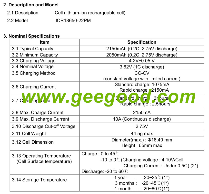 Model: 22P 22PM / ICR18650-22P / ICR18650-22P M / ICR18650-22V