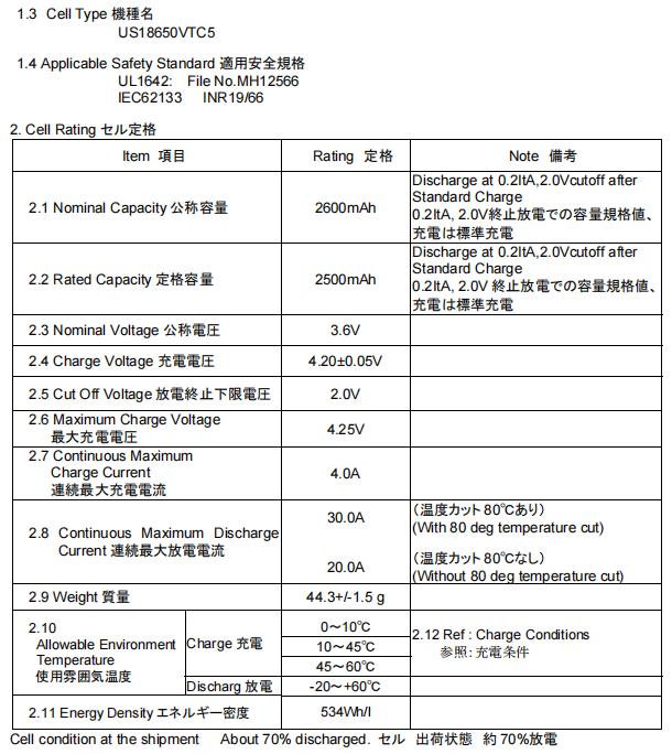 More Specification data sheet sony murata us18650vtc5 18650 vtc5 2600mAh 30A power battery, pls feel free to contact us!