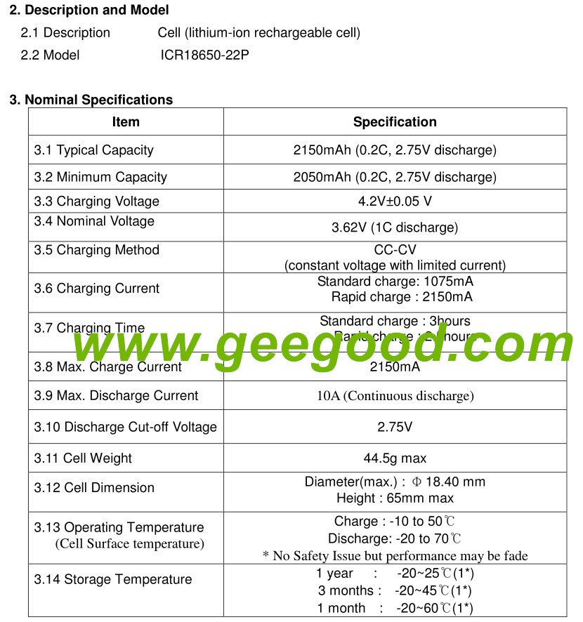 Model: 22P 22PM / ICR18650-22P / ICR18650-22P M / ICR18650-22V