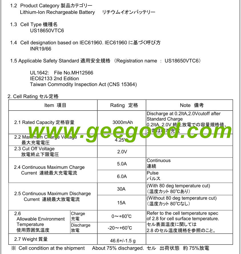Original Sony muarata 18650 VTC6 3000mAh 30A battery data sheet / specification: